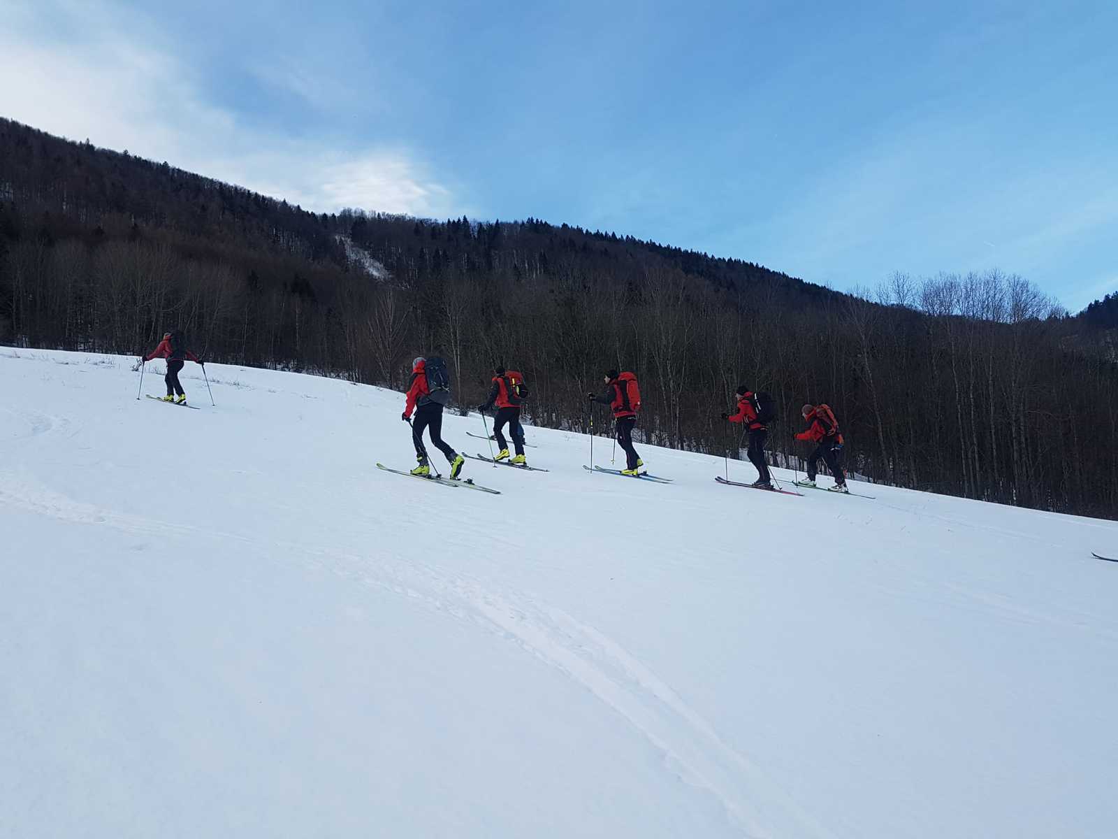 Die Erkenntnisse daraus wurden beim Aufstieg in Kleingruppen umgesetzt. Ziel des Aufstieges war die Traisnerhütte auf der Hinteralm Die wechselnden Verhältnisse erforderten den sicheren Umgang mit Harscheisen und einer sauberen Spuranlage im bis zu 35 Grad steilen Gelände.